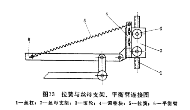 在保證拉簧質量的情況下,為使平衡吊在空載時得到更好的平衡效果,應在絲母支架的上端裝一個可上下調整的調整塊,以調節彈簧的拉力。