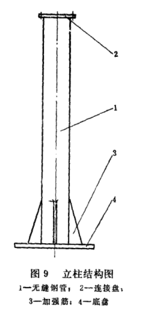 立柱用以支承平衡吊回轉部分及額定起吊零件的重量,所以要求有足夠的剛度。立柱的結構一般選用大口徑無縫鋼管與連接盤、加強筋、底盤等零件焊接而成(圖9)。焊后要進行退火處理。立柱的尺寸可參閱表2。