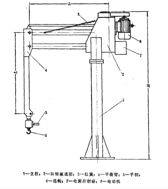 平衡吊主要由立柱1、回轉減速箱2、拉簧3、平衡臂4、手柄5、吊鉤6、電源控制箱7及電動機8等零部件組成,如圖所示。其外型尺寸參閱表1。