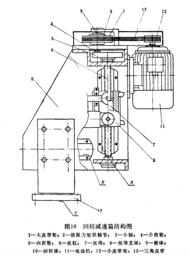 回轉減速箱由大皮帶輪1、力矩聯軸節2、小軸3、小齒輪4、內齒輪5、絲杠6、絲母7、絲母支架8、箱體9以及回轉座10等零件組成。回轉減速箱與電動機11、電源控制箱及平衡臂相連接,其結構如圖10所示。