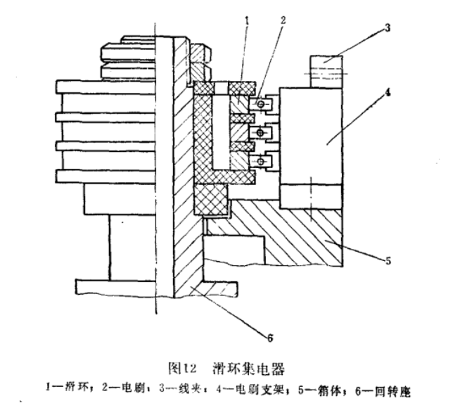 滑環集電器的滑環1固定在不旋轉的回轉座6上,電源導線從立柱的底部引入,通過回轉座的中心孔接在滑環上。